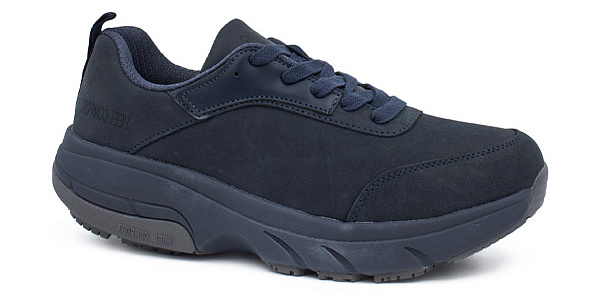 Верх выполнен из натуральной матовой кожи глубокого синего цвета. Задник и мыс дополнительно укреплены во избежание завала стопы и механических повреждений изделия. Бесшовная подкладка способствует непрерывной циркуляции воздуха внутри кроссовок. Отличительная особенность модели - съёмная анатомическая стелька со специальными массажными шариками. Стелька, поддерживая продольный свод, также стимулирует кровообращение в стопах.Кроссовки подходят для профилактики и коррекции плоскостопия, возникновения пяточных шпор, натоптышей; предупреждают развитие деформационных процессов в ногах.