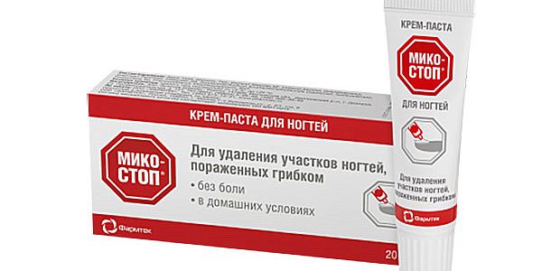 При лечении онихомикозов (грибковых поражений ногтей) часто возникает необходимость в удалении поврежденных слоев ногтя. Хорошей альтернативой хирургическому или аппаратному способам удаления ногтей является крем-паста МИКОСТОП. Препарат содержит мочевину в концентрации 40%, что позволяет безболезненно размягчить пораженные грибком слои ногтя, которые затем легко удаляются пилкой для ногтей или скребком. Не содержит: красителей, ароматизаторов, белков, спирта.