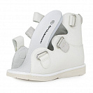 Обувь с двухсторонним высоким берцем, изготовленным с освобождением ахиллова сухожилия. Высокий жесткий берц фиксирует не только таранно-пяточный, но и голеностопный сустав, что при постоянном ношении этой обуви формирует правильное развитие суставных поверхностей и препятствует дальнейшему развитию деформации. Использование при этом съёмной сводоподдерживающей ортопедической стельки с углублением для размещения пятки позволяет правильно сформировать свод стопы.